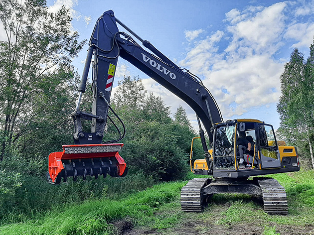 Мульчер, присоединенный к экскаватору, оборудован ротором с зубьями или лезвиями. Он служит для измельчения деревьев и растительности в мелкую мульчу, которая остается на месте или может использоваться в качестве удобрения. - Обработка лесополосы